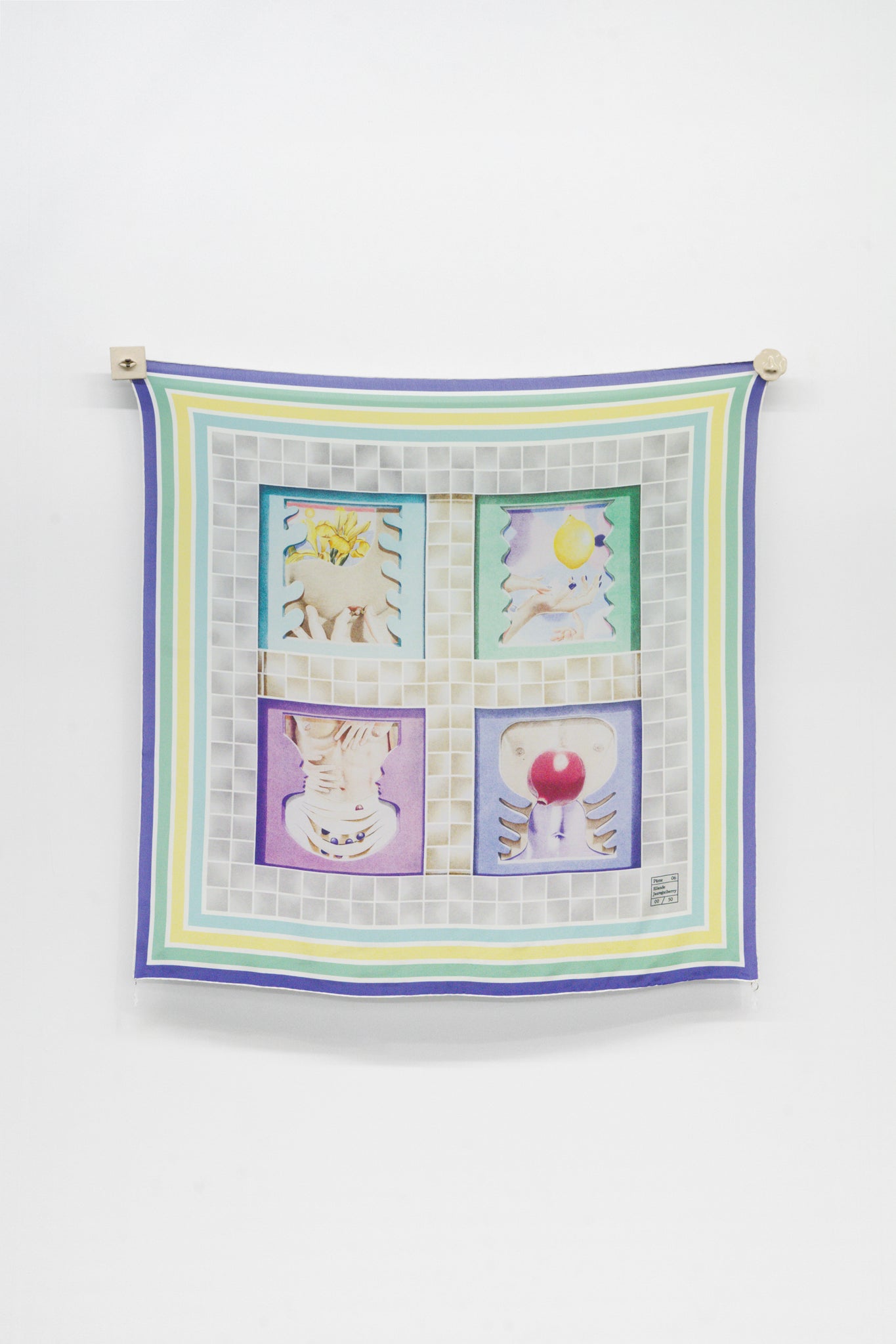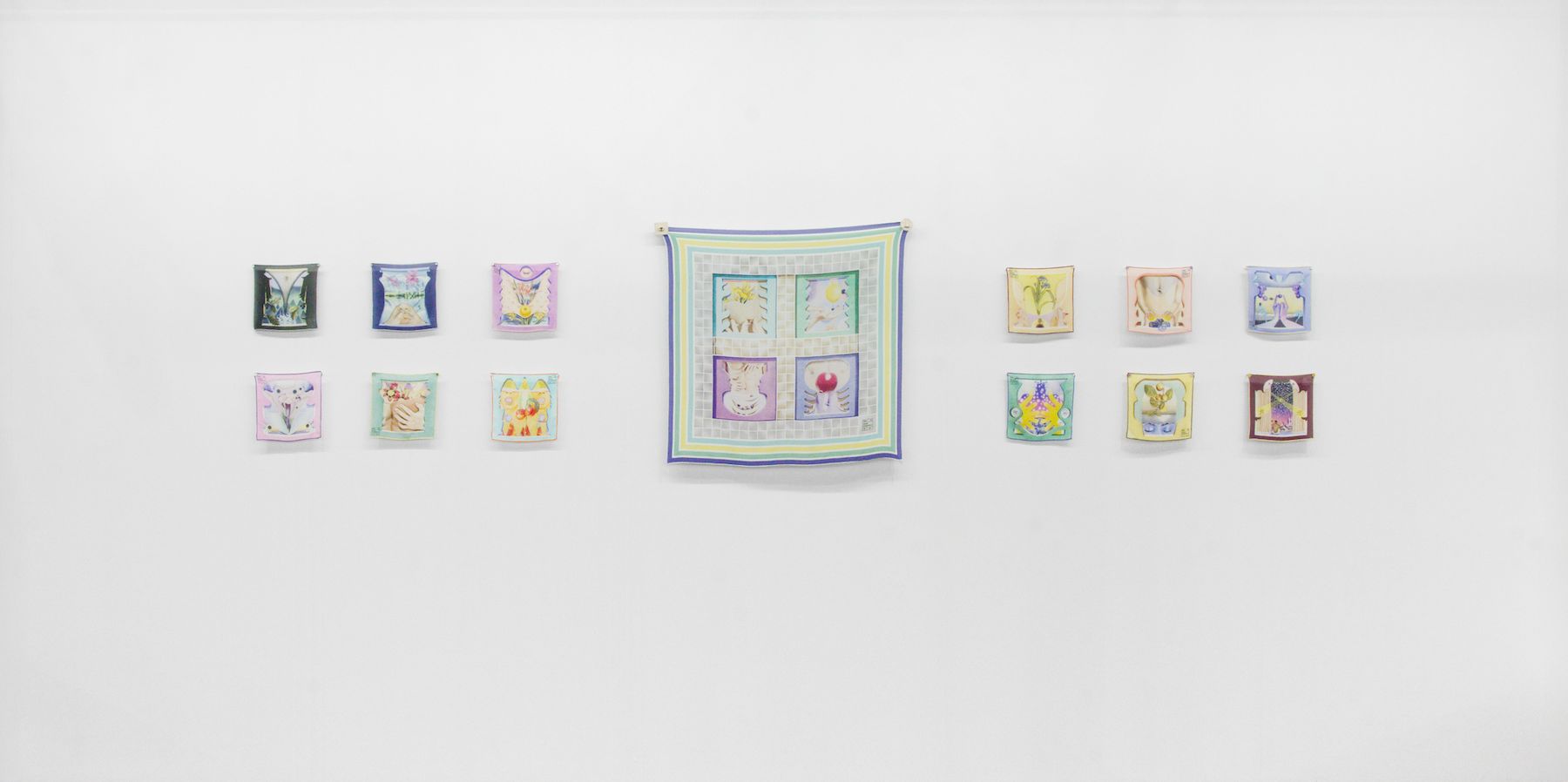 The thirteen prints were conceived to be hung freely on the wall, allowing each silk square to shift gently, evoking the fleeting pages of a calendar.